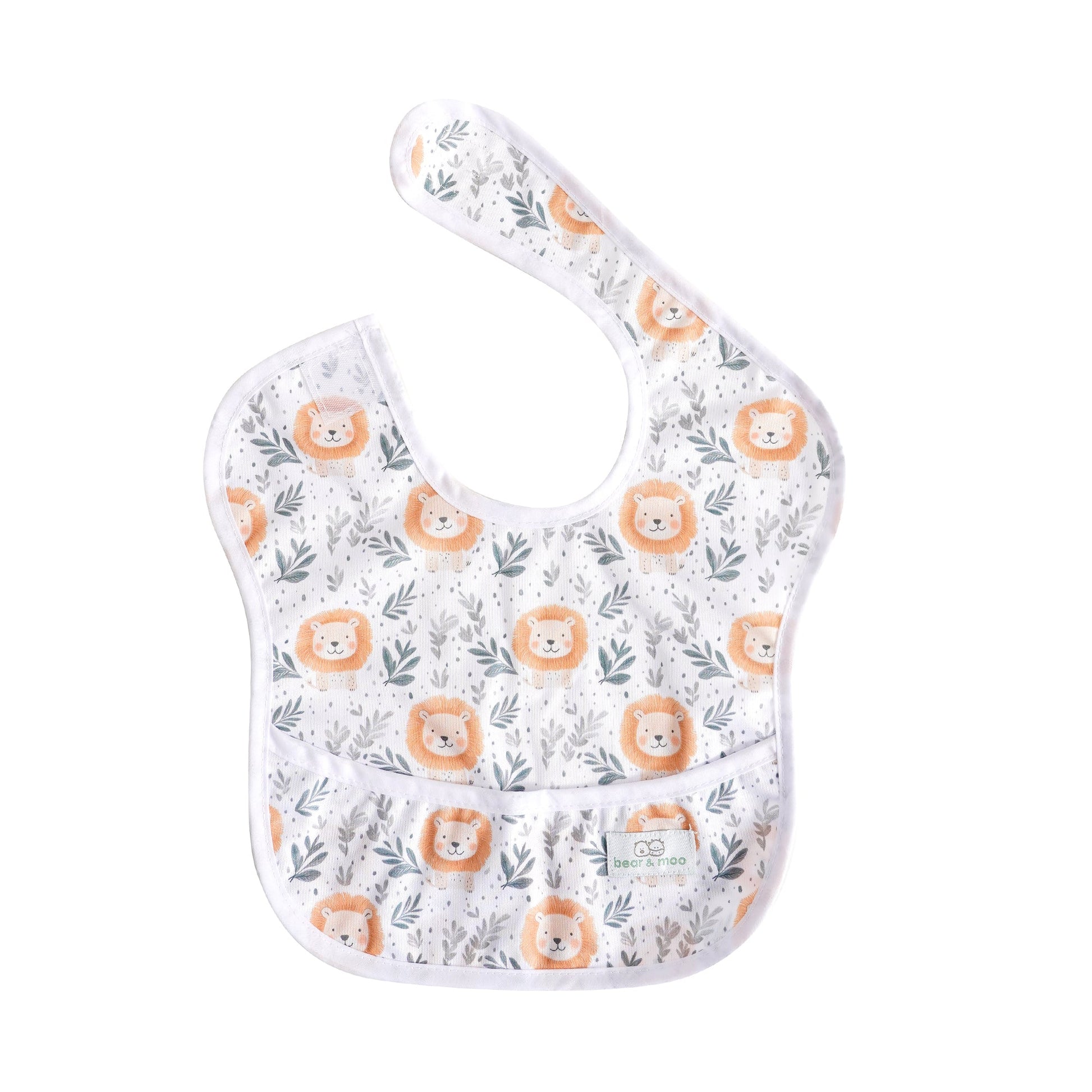 Bear & Moo Classic Bibs are in the same wipeable material as our Sleeved Bibs but in a traditional style. Velcro fastening at the back for quick closing and a pocket at the front for catching mess.
