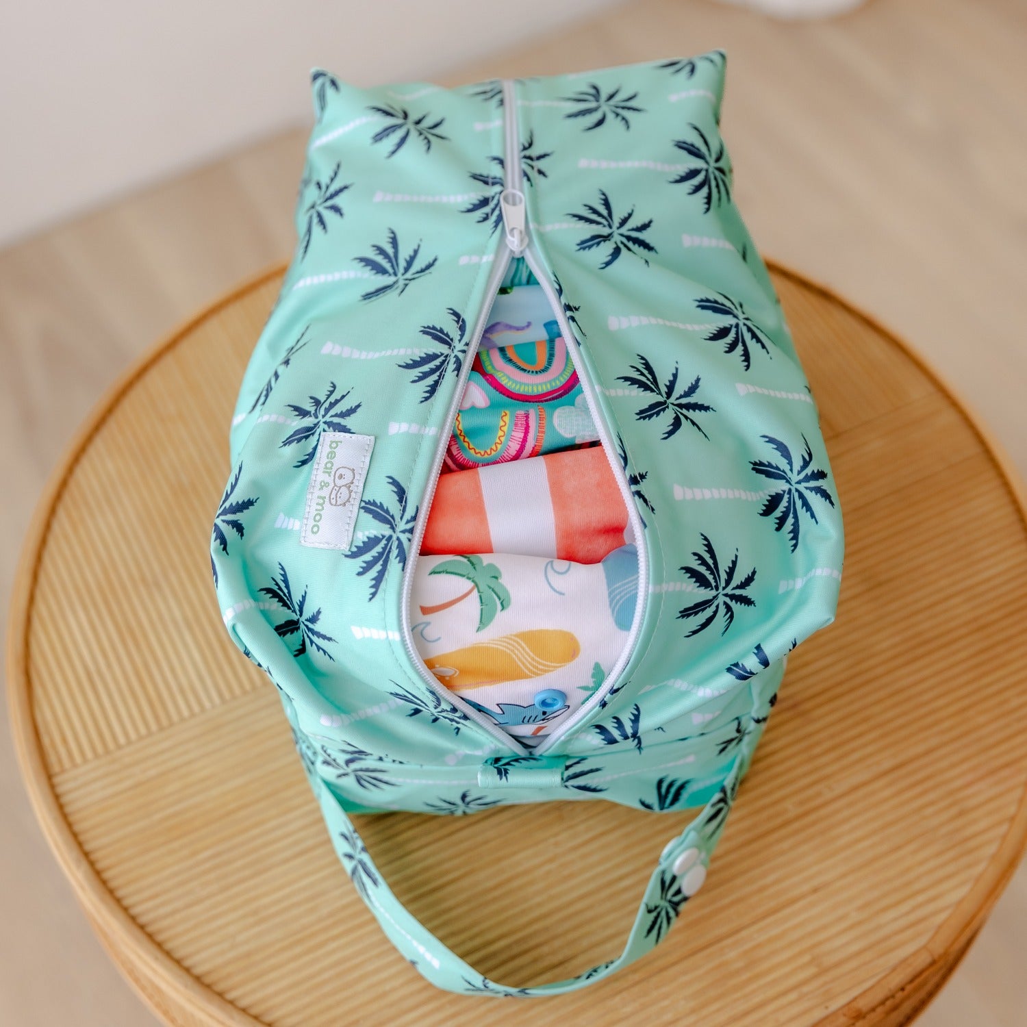 Our Mint Tropics Nappy Pod will hold eight One Size Fits Most nappies, and will even hold a pair of shoes!