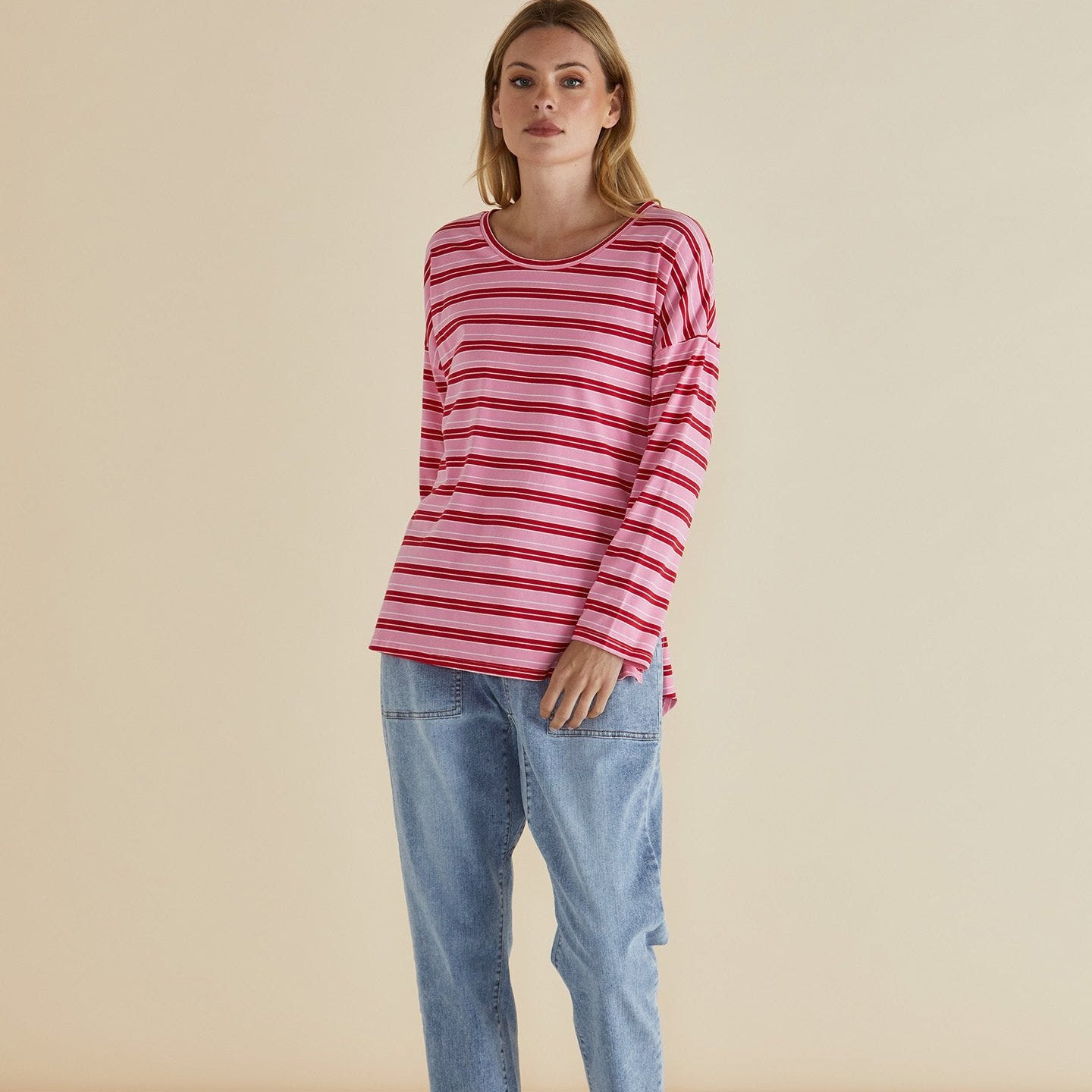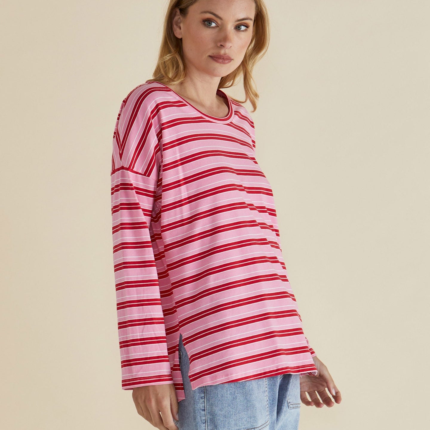 The Taylor Tee is the perfect addition to any casual wardrobe, offering effortless style with its drop shoulder sleeves and round neckline. The side splits add a relaxed touch to the classic tee design, ensuring you feel comfortable and chic all day. With a relaxed fit that’s both flattering and easy to wear, this Betty Basics tee pairs beautifully with jeans or joggers, making it the ideal choice for a laid-back, put-together look.
